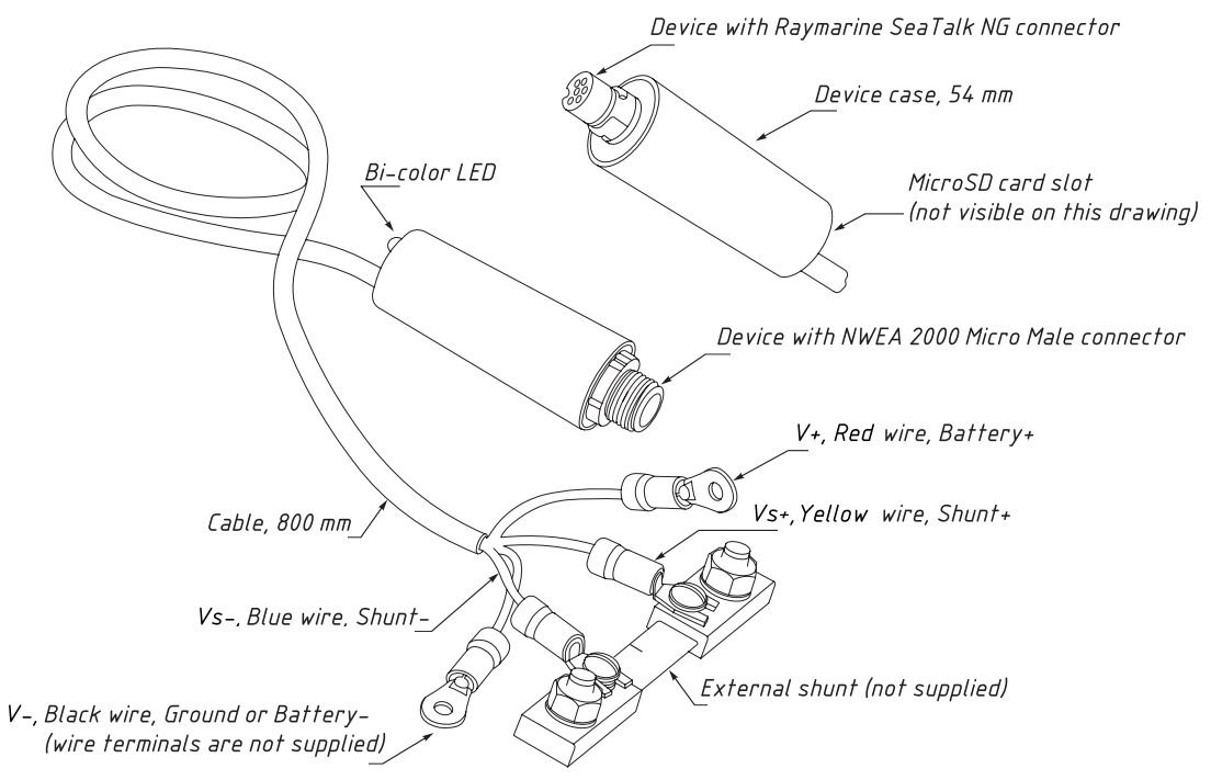 The Battery Monitor can be used with any single DC source (i.e. alternator, wind generator, etc.) or load (windlass, refrigerator, etc.), but it is primarily designed for monitoring a vessel's battery. To operate as intended, it requires an appropriate external shunt (not supplied with the Device); shunts in the range from 5A to 1200A are widely available (please refer to Section V "Choosing a Shunt" of the User Manual). It can be configured to use data from a NMEA 2000 thermometer connected to the battery to detect the charge state and health more accurately and report temperature along with voltage and current data.
